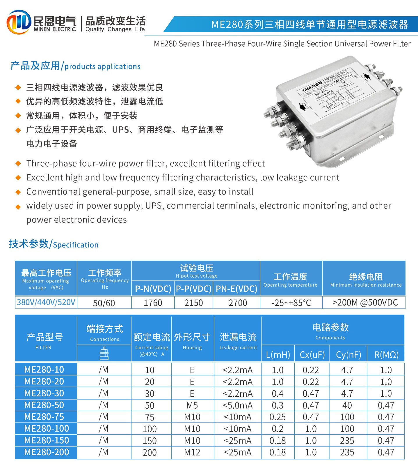 ME280系列單節三相四線電源濾波器