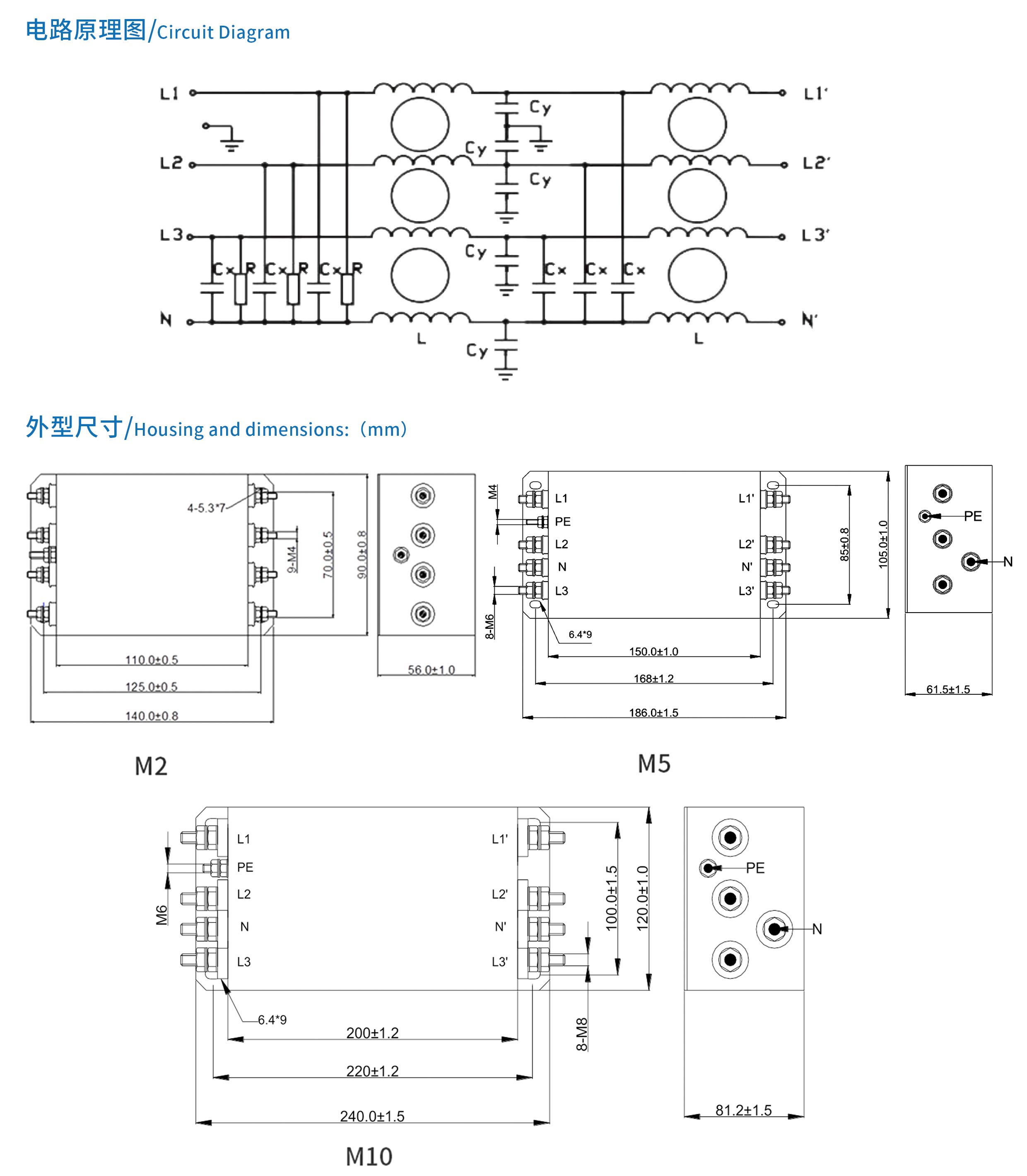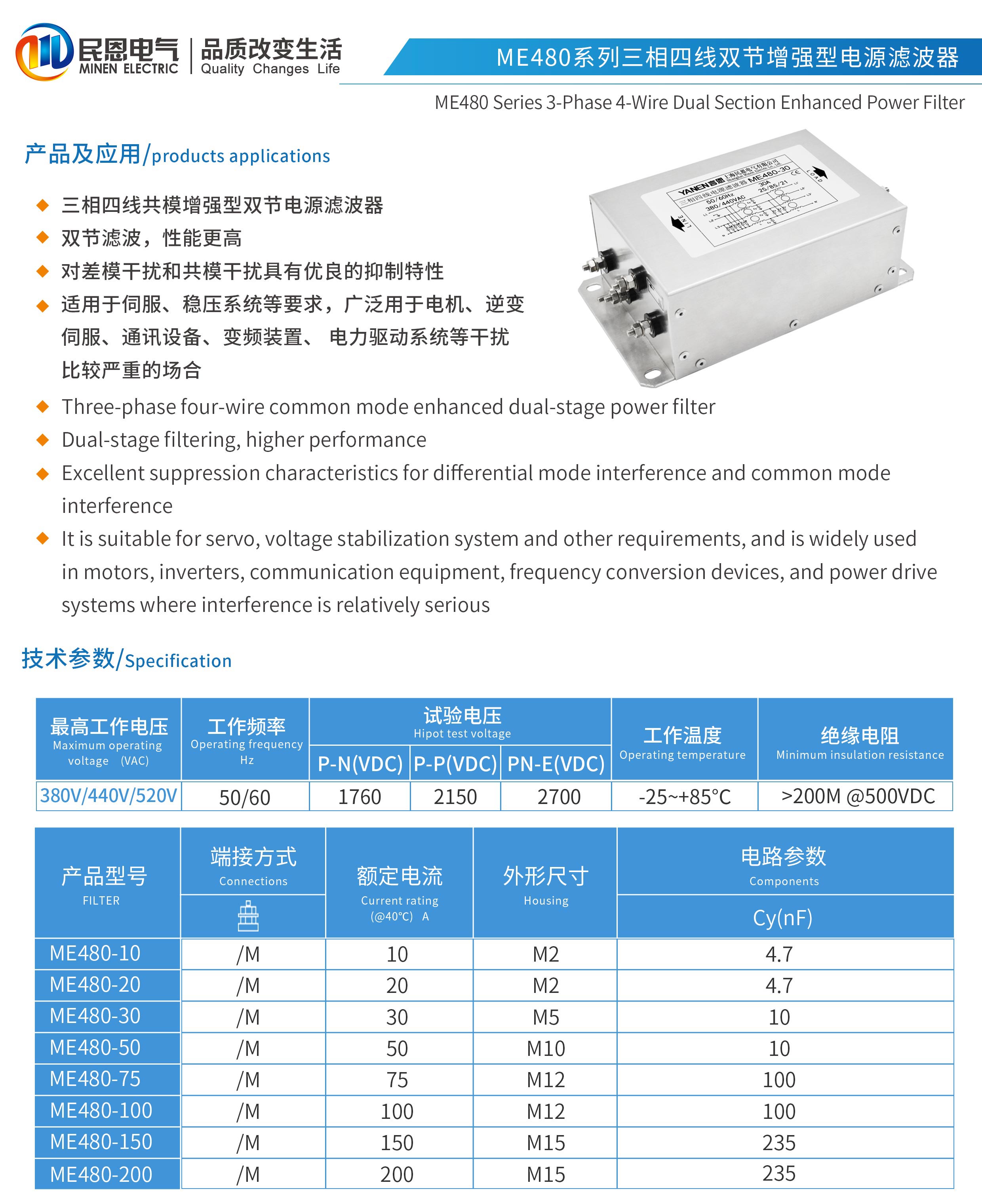 三相四線共模增強(qiáng)型雙節(jié)電源濾波器,雙節(jié)濾波,性能更高,對差模干擾和共模干擾具有優(yōu)良的抑制特性