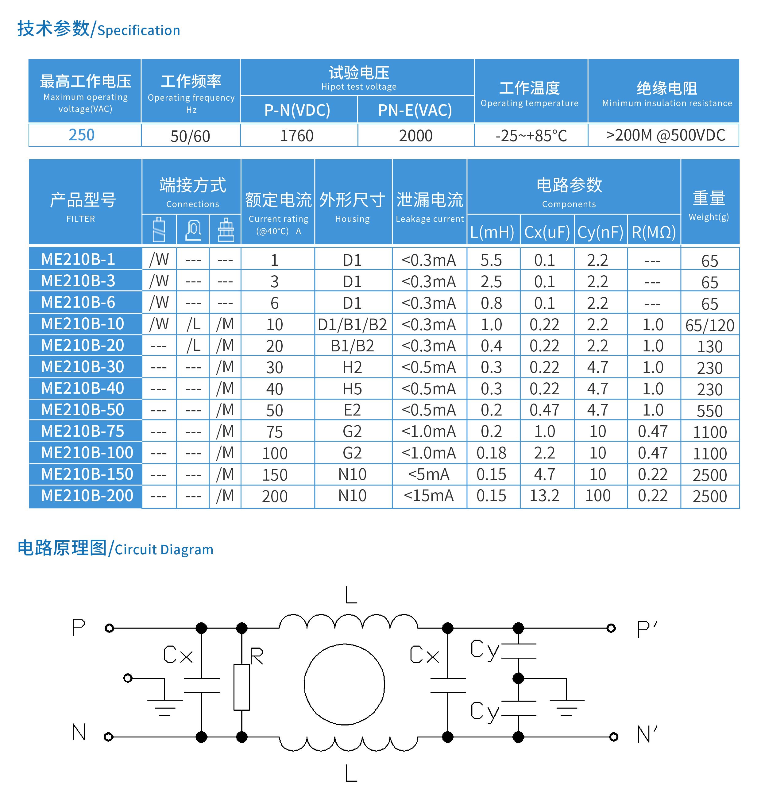 ME210B系列醫(yī)療專用單節(jié)電源濾波器