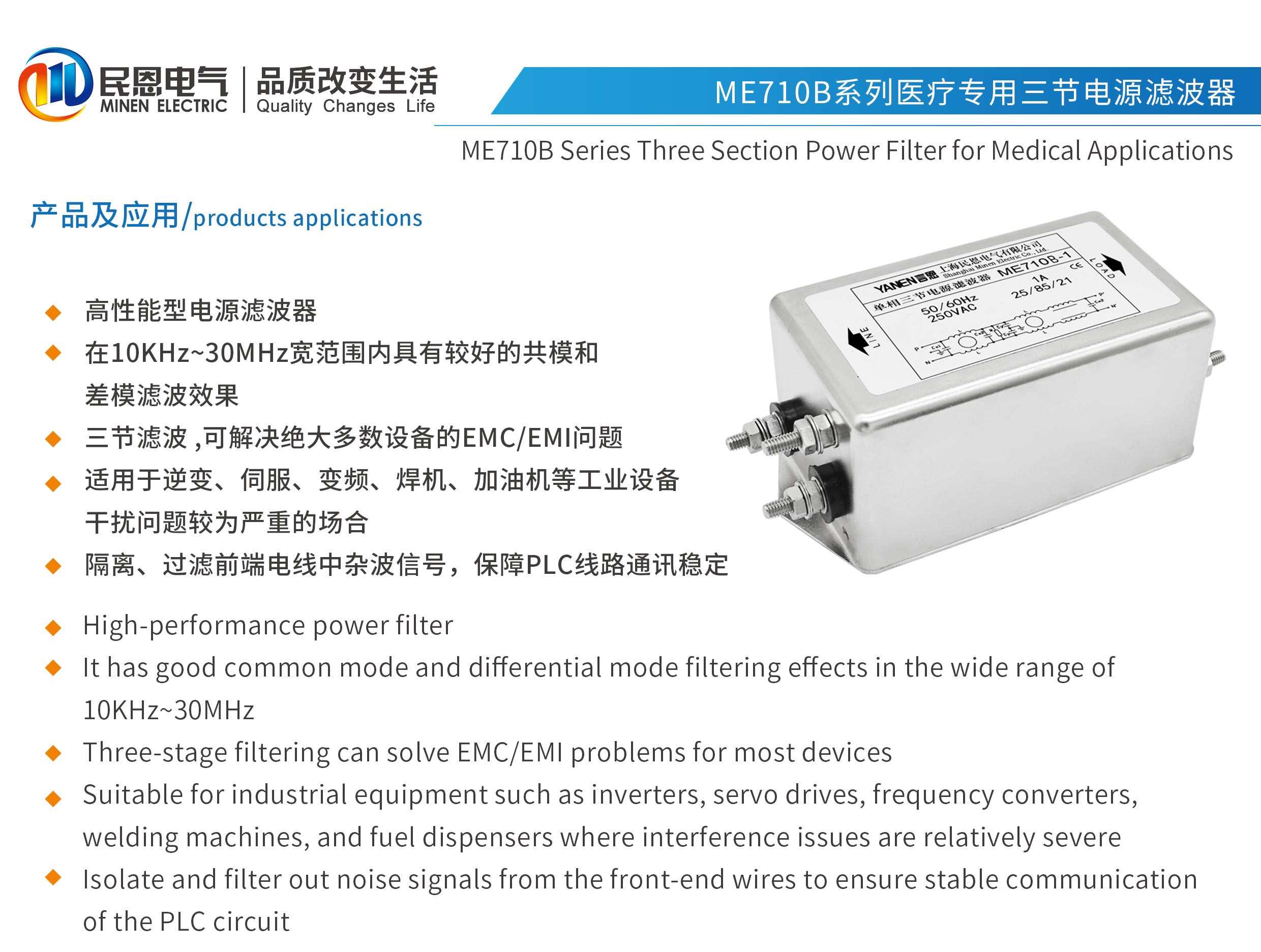 高性能型電源濾波器,在10KHz~30MHz寬范圍內具有較好的共模和差模 濾波效果 三節濾波 ,可解決絕大多數設備的EMC/EMI問題。