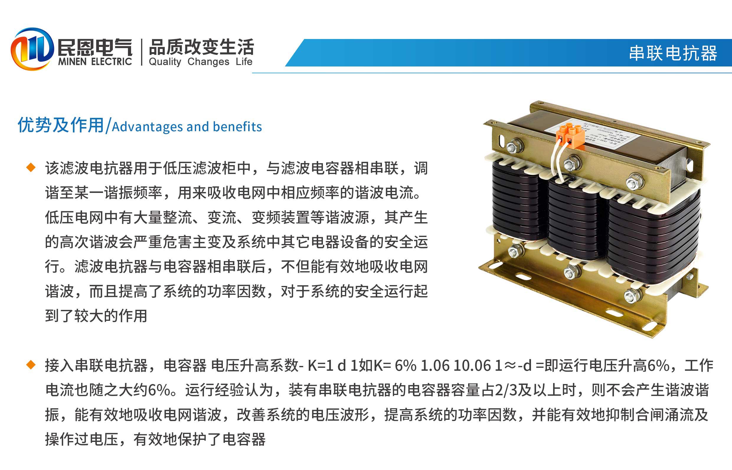 該系列干式鐵芯單相串聯電抗器用于低壓無功補償柜中,與單相電容器相串聯。 當低壓電網中有大量整流、變流裝置等諧波源時,其產生的高次諧波會嚴重危害主變及其它電器設備的安全運行。電抗器與電容器相串聯后,能有效地抑制電網諧波,改善系統的電壓波形,提高系統的功率因數,并能有效地減小合閘涌流及操作過電壓,保證了電容器的安全運行。鐵心采用優質低損耗冷軋硅鋼片,鐵心柱由多個氣隙分成均勻小段氣隙采用環氧層壓玻璃布板作間隔,氣隙間及鐵餅與鐵軛間采用耐高溫高強度粘接劑粘接,以保證電抗氣隙在運行過程中不發生變化,同時有效減少鐵芯餅之間的震動,從而降低噪升。線圈采用F/H級漆包銅扁線或漆包鋁扁線繞制,排列緊密且均勻,有較好的散熱性能。電抗器的線圈和鐵芯組裝成一體后經過預烘→真空浸漆一熱烘固化這一工藝流程,采用F/H級浸潰漆,使電抗器的線圈和鐵芯豐固地結合在一起,不但減小了運行時的噪聲,而且具有極高的耐熱等級,可確保電抗器在高溫下亦能安全低噪音地運行。