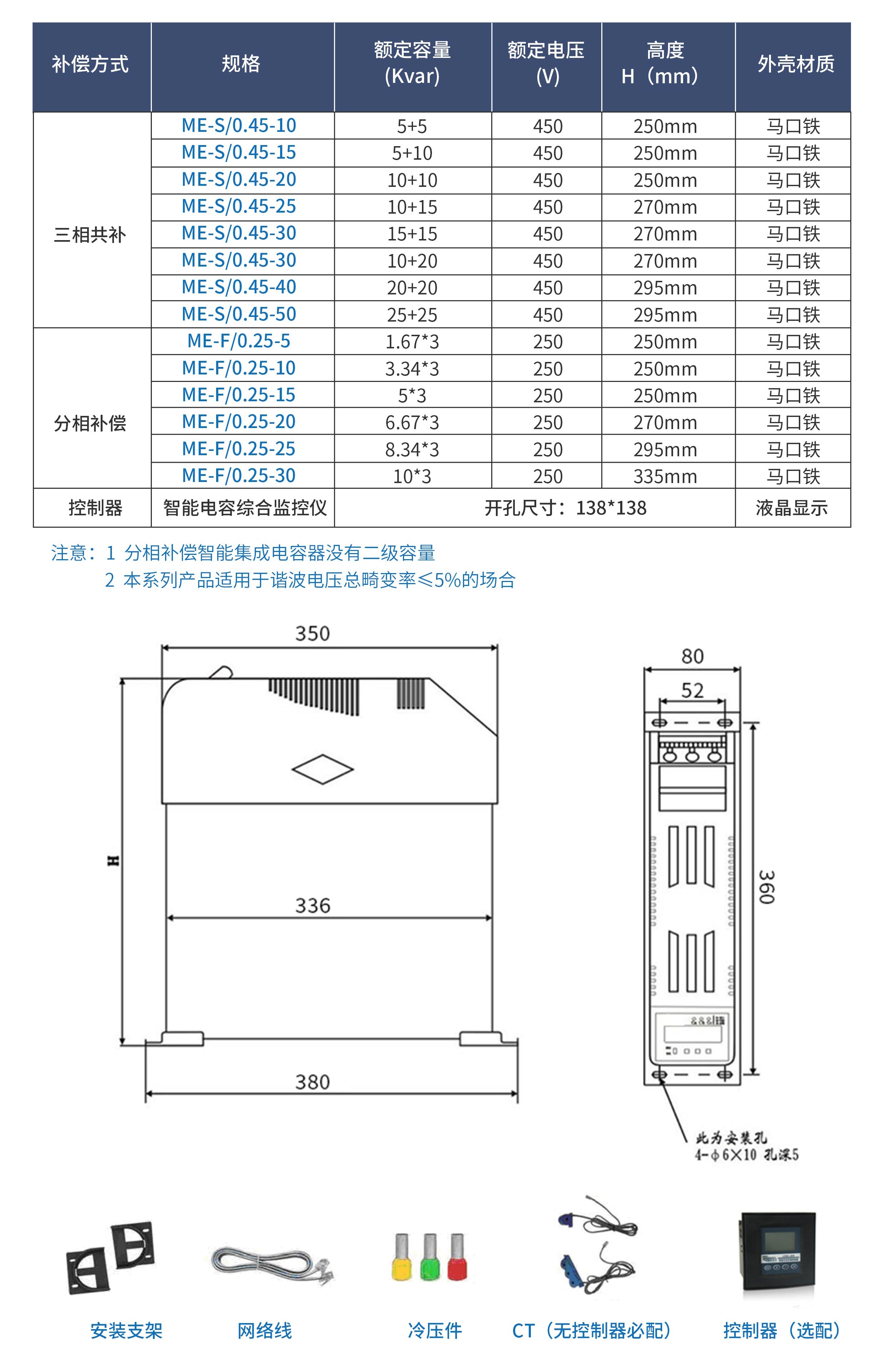 低壓智能集成電力電容器,是我公司開發研制的擁有全部自主知識產權的新一代無功補償裝置,產品通過國家電力工業部無功補償成套裝置質量檢驗測試中心型式試驗檢測。 產品由電網參數檢測模塊、可控硅模塊、繼電器或切換電容器專用交流接觸器模塊和保護模塊組成一個獨立完整的智能補償單元。真正做到過零投切,滿足用戶對無功補償要切實達到提高功率因數、改善電壓質量、節能降損的實際需求。具有體積小、無涌流 、無諧波注入、功耗低、接線簡便、補償充分等諸多優點。控制方式采用了RS485有線組網通訊,極大簡化了接線工序,同時大大提高了補償效率。