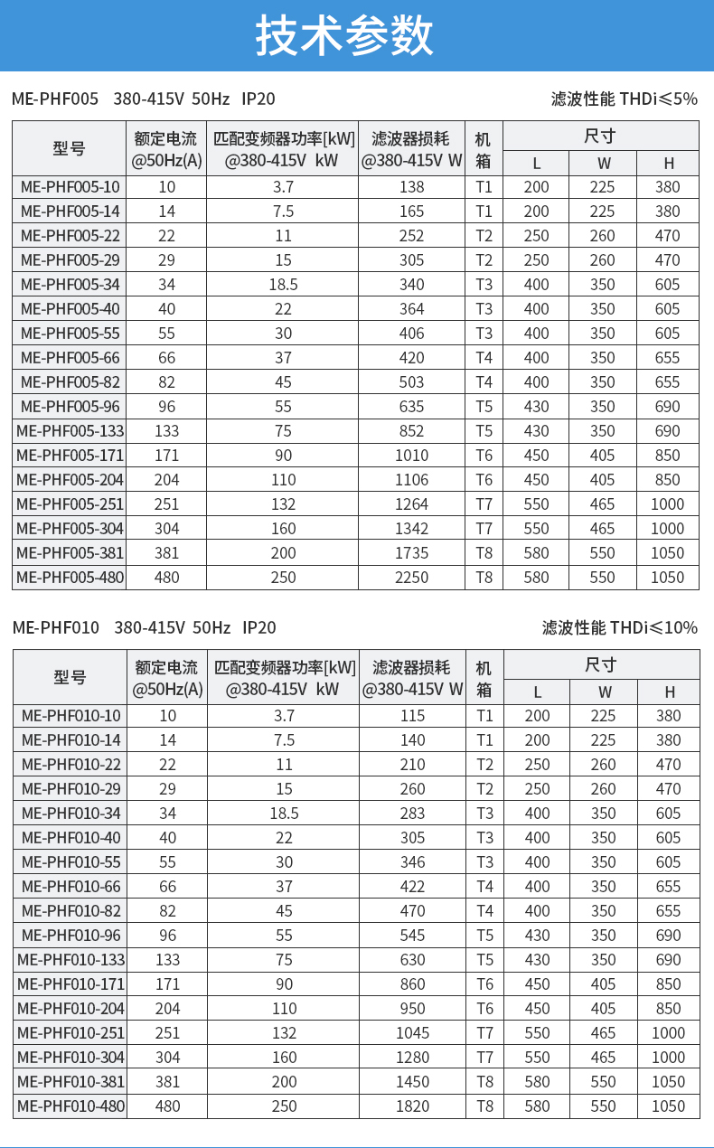 ME-PHF 010 濾波性能THDi≤10% ME-PHF 005 濾波性能 THDi≤5%